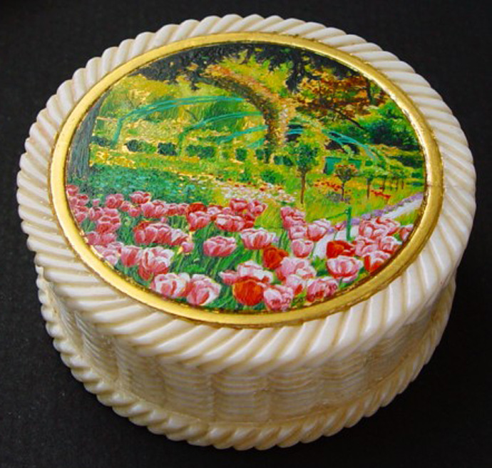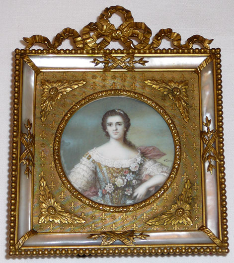 Madame Victoire I met someone at a miniature Society function who purchased a miniature from a flea market. It's framed in what appears to be an antique French frame and she assumed that the miniature was a print. When she removed the back of the frame, however, she discovered the painting was done on some leather-like surface stretched over a hard surface that might be ivory or some kind of glass. The words Madame Victoire and Nattier were on the back with other things penciled in by the previous owner(s). Nattier is also the signature on the miniature. Through a magnifying glass, it appears that the miniature was created from a series of tiny lines that may have been done by a one-bristle brush used during that period. She received a little feedback from the National Gallery of Art and from the Andrew W. Mellon Foundation. She researched at the Library of Congress and found the lovely lady in a biography on the artist Jean-Marc Nattier (1685-1766). It was written in French so she had a few pages translated. It pertains to a painting in the Louvre titled, Portrait de Madame Victoire de France par Jean-Marc Nattier, 1748 which is a larger work, 81 x 64. She learned that Mr. Nattier was the official court painter for Louis XV and the subjects full name was Marie Louise Therese Victoria detta Madam Victoria, daughter of Luigi XV. This small work may have been done from the larger work, as a token or memento. The owner is still researching, but is having a grand time sleuthing info on this little work, which she hopes is the real deal! |